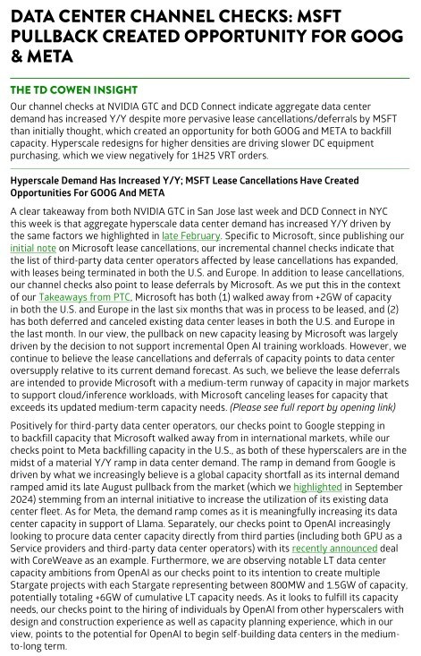 微软并非首次释放这一信号。今年2月24日,TD Cowen就曾报告称,微软取消了多项数据中心租赁协议,总涉及功率数百兆瓦,引发市场的广泛关注。那个时候,市场便已开始担心,这仅仅是微软削减资本支出的开始,其他科技公司或许也会紧随其后。