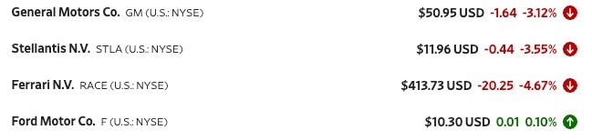 早盘曾涨超1%的通用汽车(GM)转跌,最终收跌3.12%,Stellantis NV(STLA)下跌3.55%,而午盘曾跌近2%的福特(F)尾盘转涨,收涨0.1%。